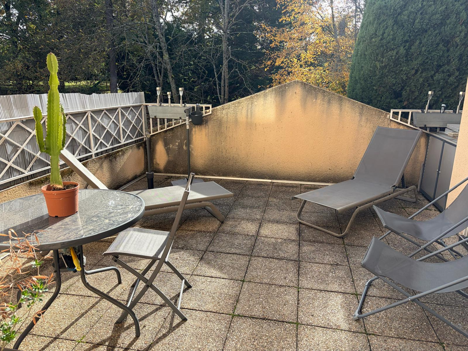 L’appartement, situé au premier étage, propose une entrée fonctionnelle avec rangements qui s’ouvre sur une pièce de vie baignée de lumière. La cuisine, aménagée et équipée, partage un bel espace avec le séjour et s’étend naturellement vers une terrasse exposée plein sud, parfaite pour profiter d’instants de détente ou de repas en extérieur. L’espace nuit comprend deux chambres agréables, une salle de bain et des toilettes indépendantes, garantissant confort et intimité.